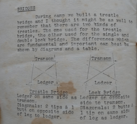 1927 ‘and on June 13th the Chief came to a large Rally on Sheep’s Green. The 9th built a double trestle Bridge over Snob’s, the best they ever achieved’. C T Wood