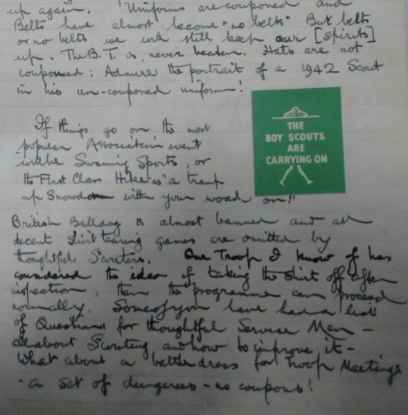 1942 Concern was expressed by the Mid Cambridge LA that without extra coupons for uniform the Scouts, who were in long trousers all day, were increasingly reluctant to wear their (now) small, old clothes that they could not replace.