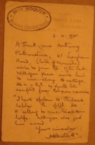 Handwritten records from before the Great War have had the word ‘Catholic’ added to or alongside the titles of the 15th Cambridge (St Giles) and 16th Cambridge (St Clement). This has not been seen on any Scout form or on official documents. The hand is probably not that of the later secretary H Mallett and is perhaps more like that of the original record maker, possibly the pre war secretary, Green of the Perse. That they are written on lined paper similar to school exercise books might give credence to this proposal. That said, Howard Mallett was a member of a Congregational Church and may have been more tuned to feelings towards the unusual practices and tone of High Church Anglicanism. The ink in this word is noticeably lighter than that of the word immediately before in both cases, they were clearly added later, as an afterthought during the compilation of the records or on another occasion.