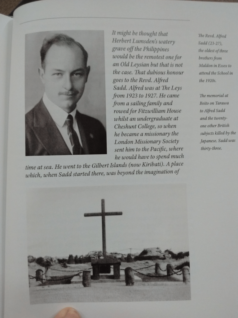 The Kiribati Scout Association, formally Gilbert and Ellice Islands, record the death of a British scoutmaster during the Japanese occupation. This is Alfred Sadd who worked with the 1st Gilberts Scout Troop and Crew. Further details are given in ‘The Left Handshake’ by Hilary St George Saunders.