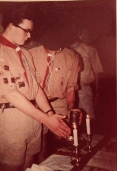 The following three pictures are from a Rover Scout Investiture in the 13th Cambridge Crew. After the advent of berets, somewhere between 1949 and 1966; possibly, from context of the donation, one of the last to be undertaken.
