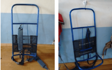 Undated – probably later than previous aluminium framed example above. Folding lower rest for storage, fixed padded straps, padded belt, adjustable back support