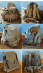 Early 1950’s Frameless, canvas, leather buckles, unpadded canvas shoulder straps, three external pockets, small top flap, no internal divisions. Used to hike through Europe