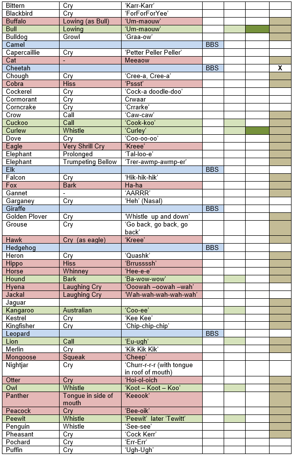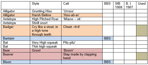 Note changed calls for Alligator, Antelope, Bat, Elephant, Woodpecker and Rhino(cerous) 1911 – 1915). These may reflect sources from different countries.