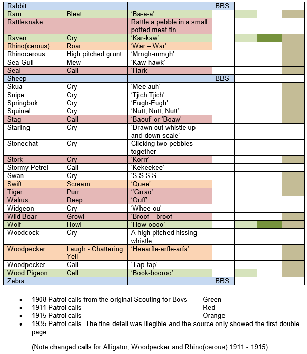 Other countries have added and some apparently swopped patrols (e.g. crocodile for alligator). I have not deliberately added these but may have done so in error. These internet sources provide pages essentially the same as UK version but do not give dates of publication or countries. Both Crow and Jaguar have been identified in such copies of the pages from Scouting for Boys but did not appear in the post WW2 copy I possess. The alternative calls may have originated in this manner.