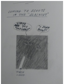 I have not unpicked any activities that were directly facilitated by the blackout. Indeed the odd behaviour of some scout activities may have been curtailed by the general watchfulness of the population. Nearer the end of the war one Scouter, posing as suspicious person to be tracked by his troop, was stopped and questioned by the local police. In June 1940 an exercise to map the area around HQ included identifying all the ARP shelters. In 1940 Snowy (Oliver) and Ken Metcalfe ‘went on an all night hike and were nearly run in by a suspicious policeman’ From the Evercircular letters