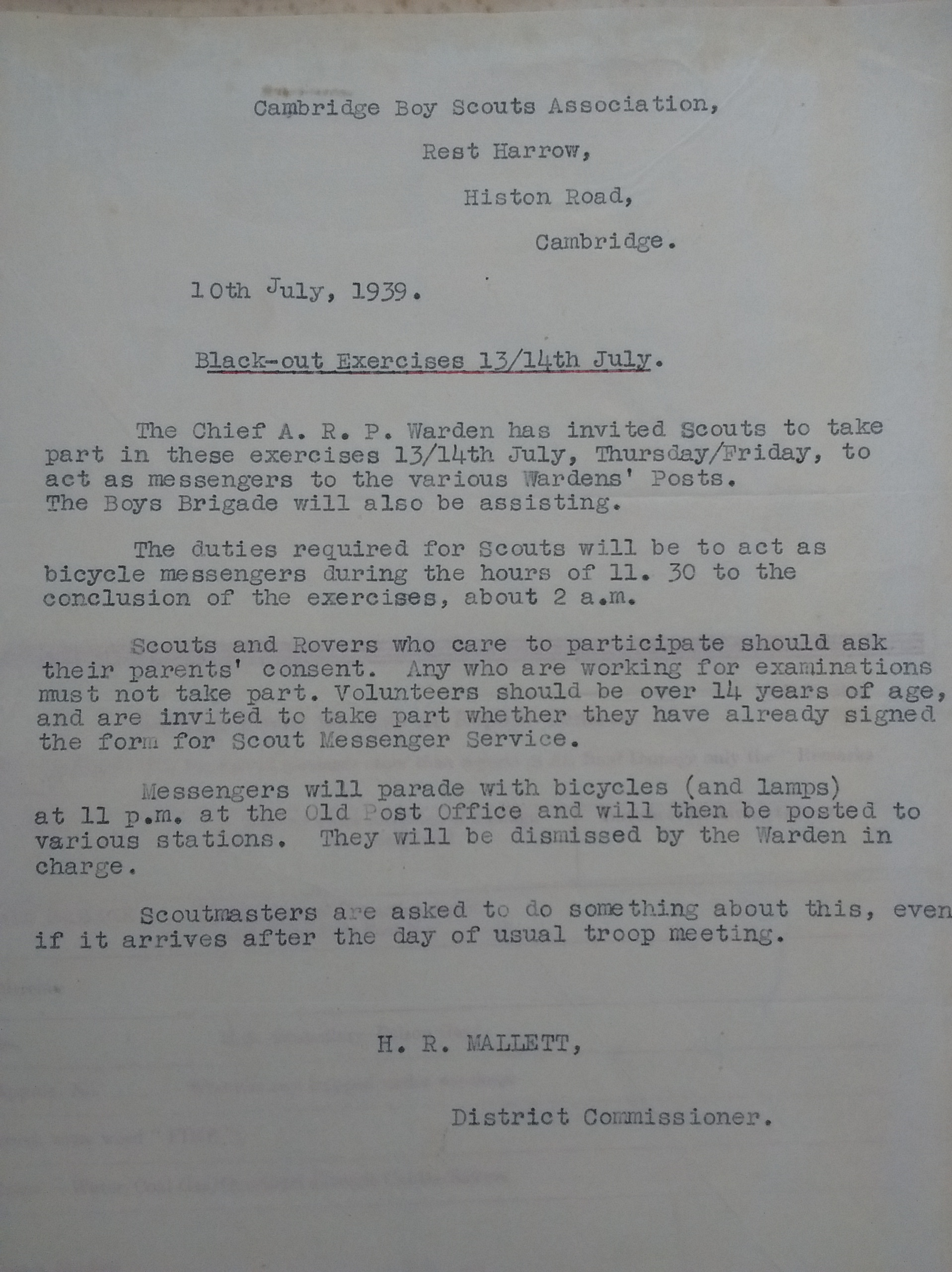 Concerns about a war started at the Munich Crisis in 1938 and many plans were put in place. In July 1939 the Scouts were invited to take part in ‘Black Out exercise’. Later many were to enroll in the Scout Messenger Service. See WW1 and WW2/ WW2/ Scout ARP Messengers.