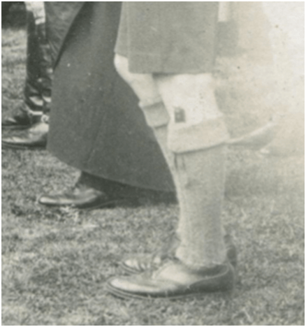 This very datable photograph was taken at a visit of the Prince of Wales to Cambridge in 1921. The very tall Rover and Scoutmaster is very likely to be C R (Jack) Benstead MC, one of three MC’s in the very first flush of University Rovers. Although poor it does appear to show a metal loop on the top of the handle. It is possible that it is his ideosyncratic placement of a folding knife, but whilst initailly identifying it as such it always struck me as a precarious placement, even with well tied garters. That said I have not seen any pictures of a skean dhu with a hoop on top, if indeed that is what it is.