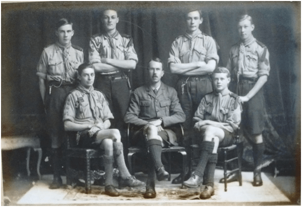 The trio seated above all wear a skean dhu, one in the right sock. One is also wearing both a clasp knife, it is too robust to be deemed merely a penknife, and Skean dhu. Gavin Malcolm MacFarlane Grieve, centre, was with the Black Watch during the war and whilst well established in Cambridgeshire the family retained a strong Scottish connection. The two either side have not been identified. Rovers were well established in this school troop up to the start of Senior Scouts. GMMG habitually wore his skean dhu when in full uniform in the 1920’s. He is not seen wearing it after that date, but he is less evident at formal events. One clear photograph of 1932 at Abington campsite opening suggests that he is not wearing one.