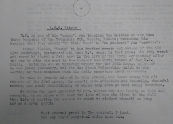 Mr Oliver Senior (Snowy’s father) made the offer of help to the 23rd in October 1942 ‘in any way he could – He admits he knows little but wants to learn’. In 1943 ‘Mr Oliver – Snowy’s father, who was helping us in the troop, spent most of the days with us in camp – this is the first time I have ever heard the …………..? of a parent of Old Scouts in Cambridge.’