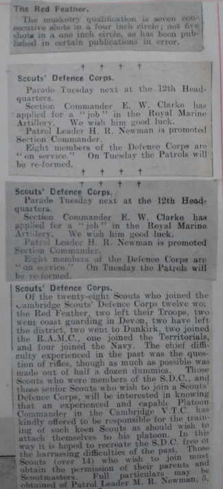 Twenty eight Scouts joined the Cambridge Scout Defence Corp, twelve of whom won the feather. Two left the Troop, two went coast watching in Devon, two left the District, two went to Dunkirk, two joined the RAMC, four joined the navy and one the Territorial’s.