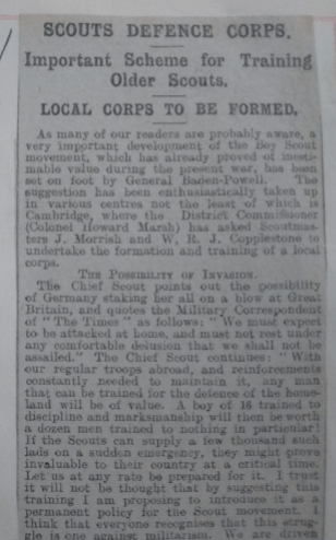 At this rally the 1st Chatteris ‘Scout Volunteer Corps’ was in attendance. It is likely that the Cambridge Scout Defence Corps had ended by this date and the links with the adult Volunteer Training Corps had also been severed.