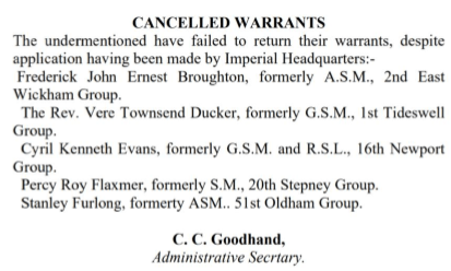 Warrants were returned to IHQ for cancellation and provided service had been satisfactory returned to the Scouter. Fred Feary, fifty years a Scout Master and awarded the Silver Wolf in 1970, was ‘satisfactory’.